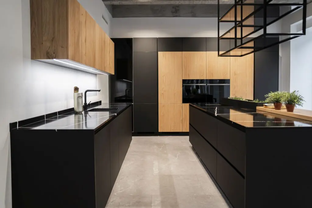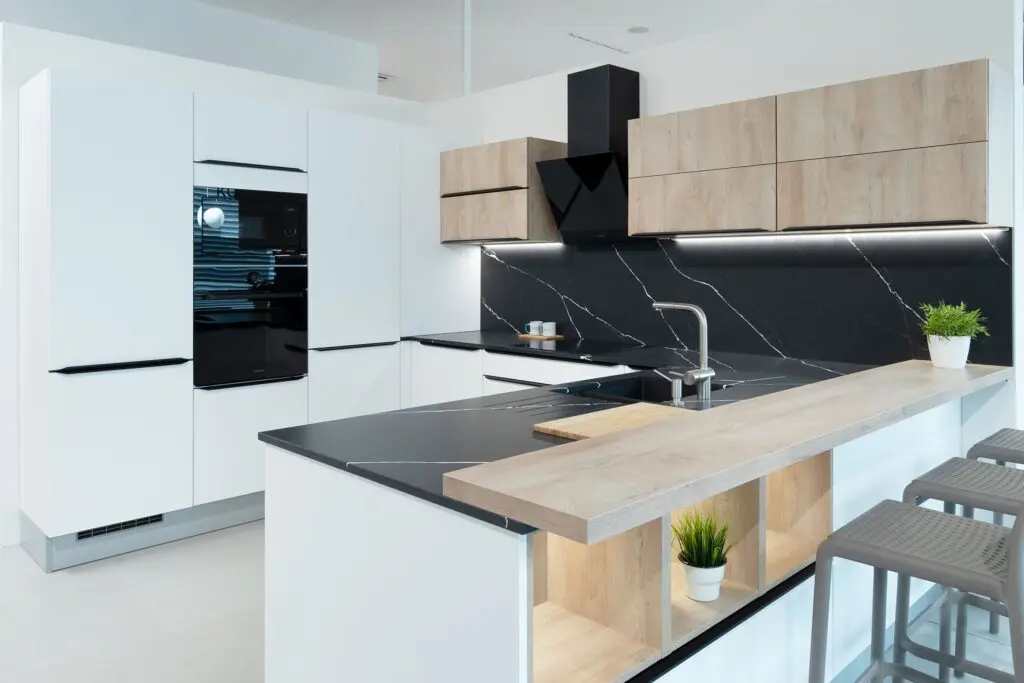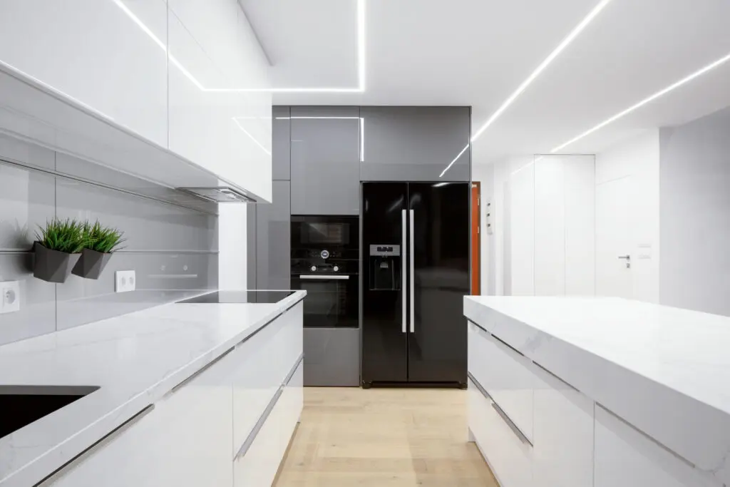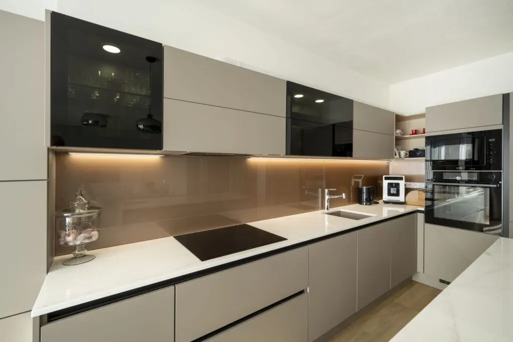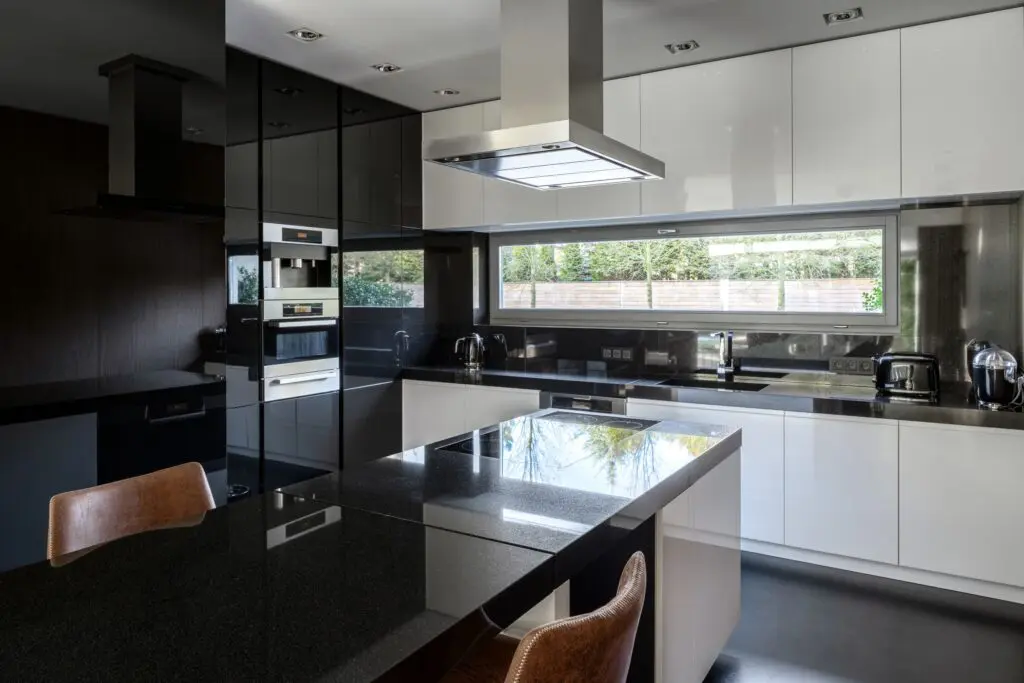 Moderní kuchyň s hladkými dvířky – nádherné mramorové žilkování nebo žulové zrnění dává vyniknout především černým nebo bílým kuchyním.